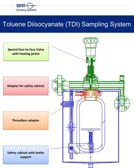Specific Hazards related to Sampling: TDI can solidify at ambient temperatures and when sampling, it is usually at high temperatures. Sample systems must incorporate a heating jacket to maintain process temperatures and adequate protection must be part of the design. TDI is not highly toxic but exposure limits have been established by OSHA regarding allowable TDI vapor concentrations in the work environment. Sample systems must be designed to protect the Operators and the environment from vapors.